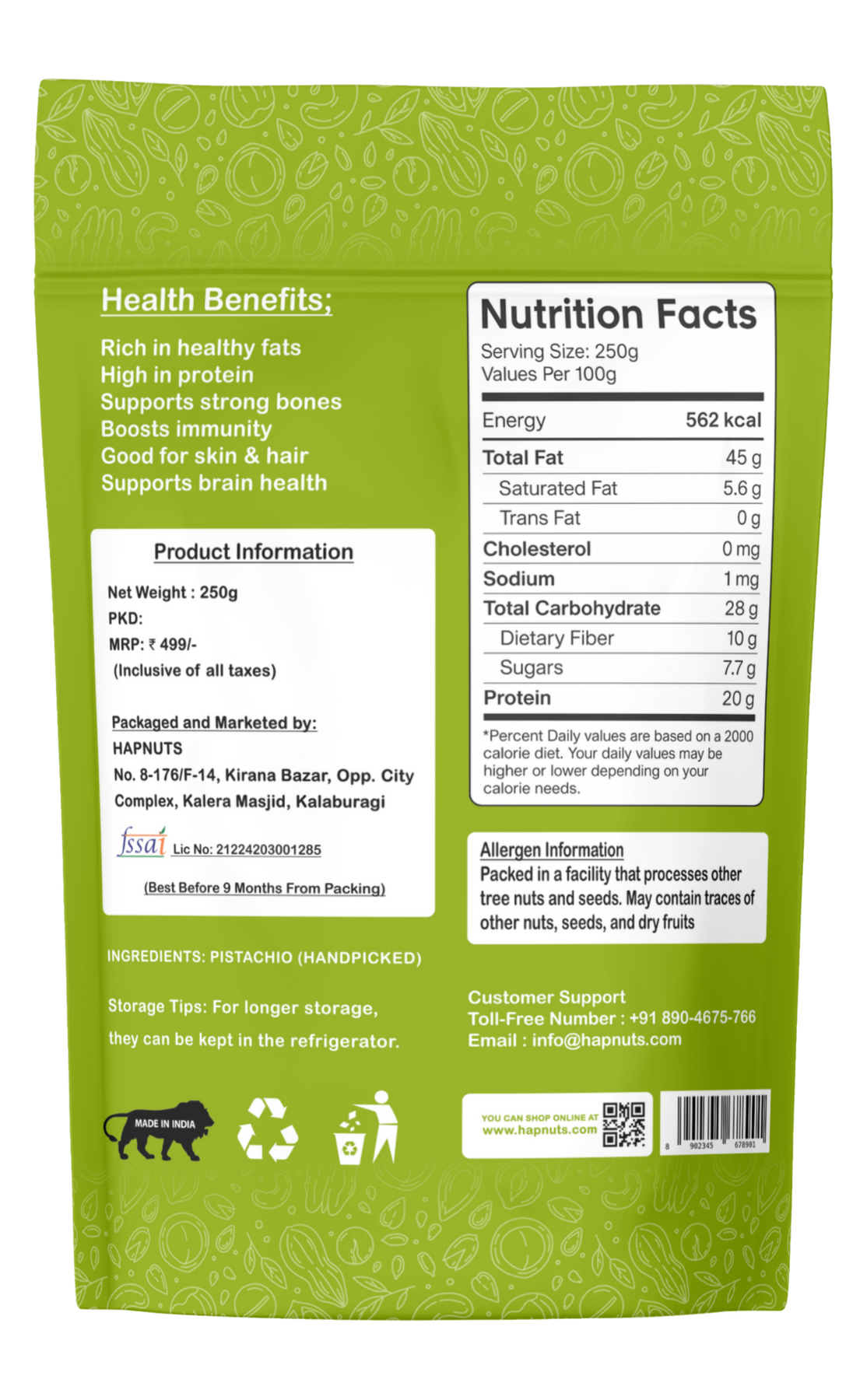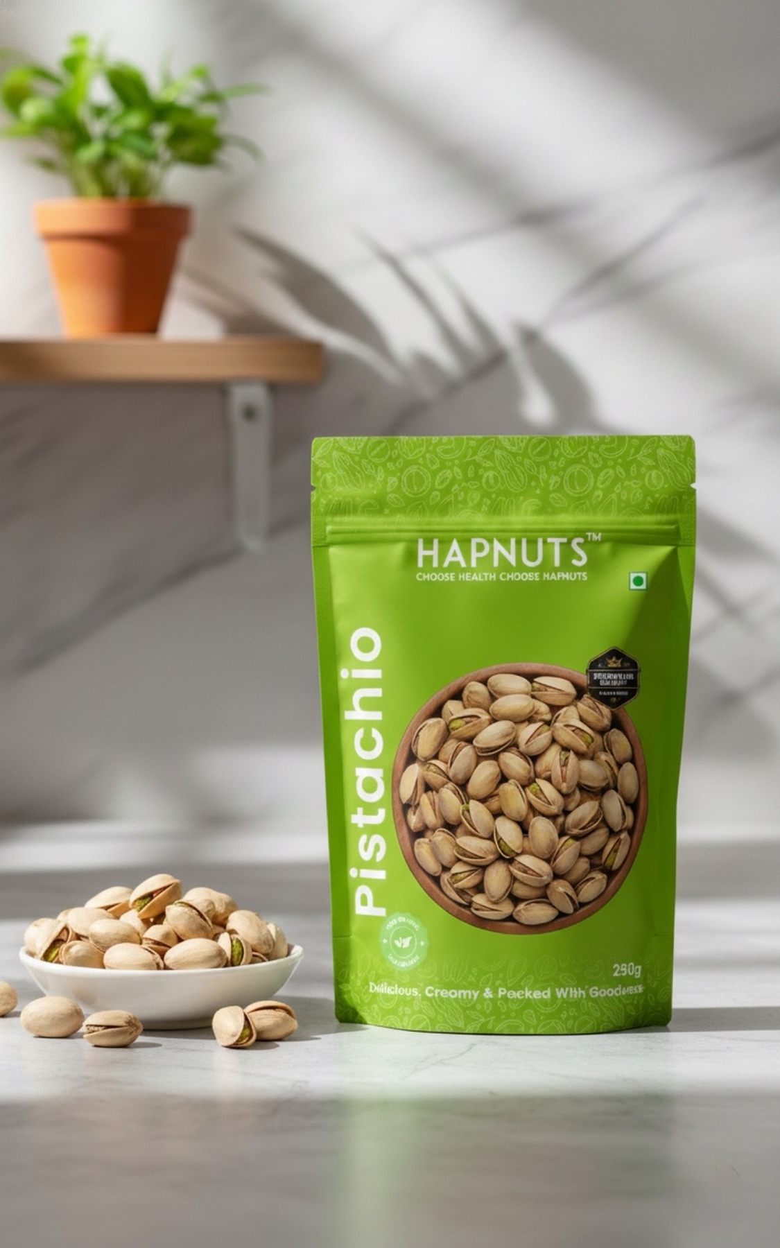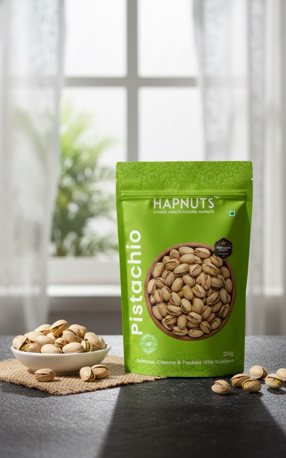 Hapnuts Premium Salted Pistachios are roasted to perfection and lightly salted to bring out their natural flavor. Rich in protein, healthy fats, and antioxidants, these crunchy delights are the perfect guilt-free snack for any time of the day.